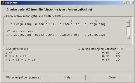 The first two lines in this panel show the mean values and standard deviations of the pulse intervals of this coda set. Following these lines are the centers of every cluster found in this coda set.